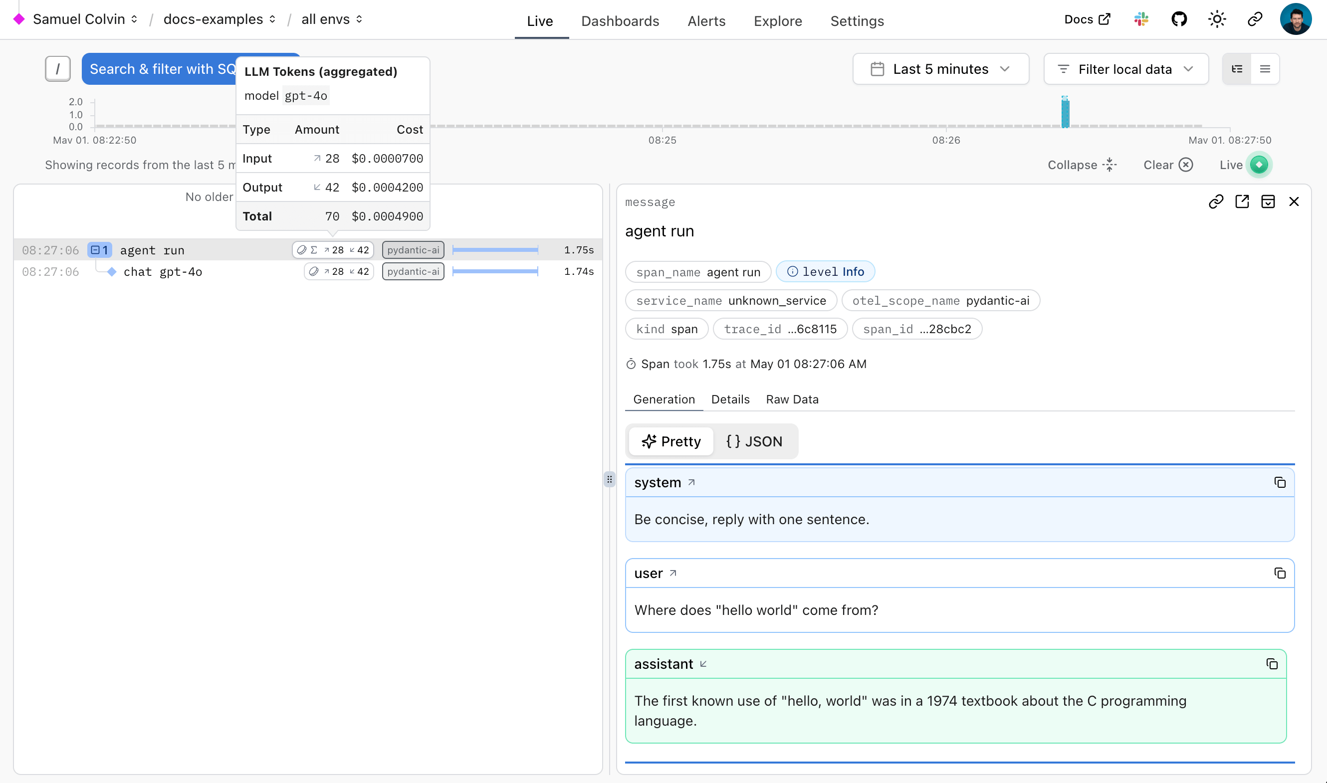 enables instrumentation of Pydantic AI.- Since we've enabled instrumentation, a trace will be generated for each run, with spans emitted for models calls and tool function execution