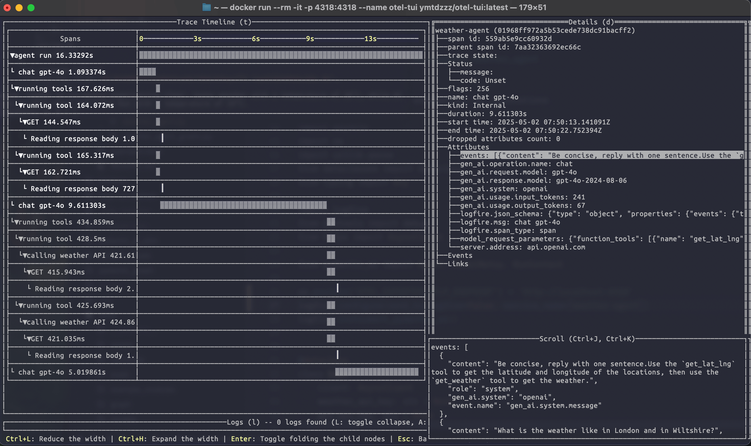 docker run --rm -it -p 4318:4318 --name otel-tui ymtdzzz/otel-tui:latest